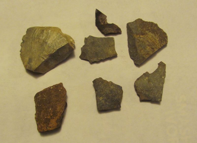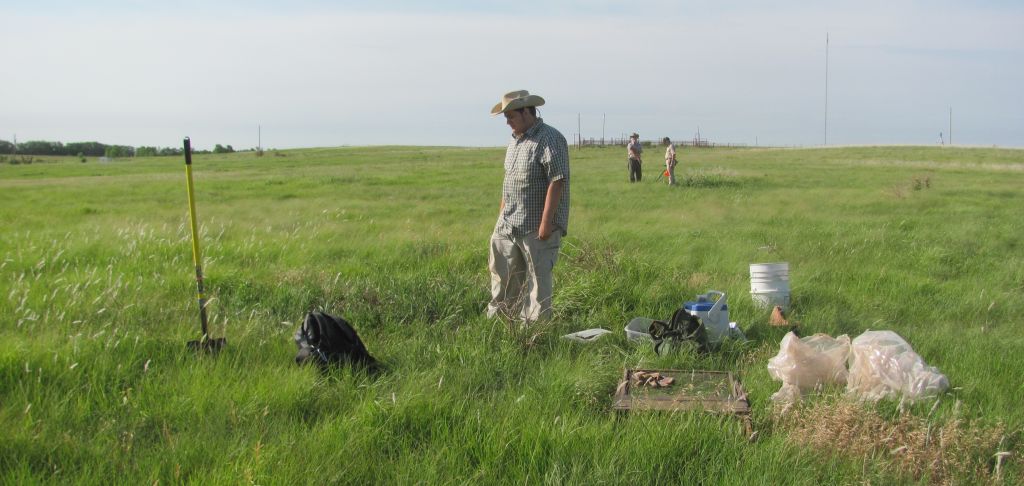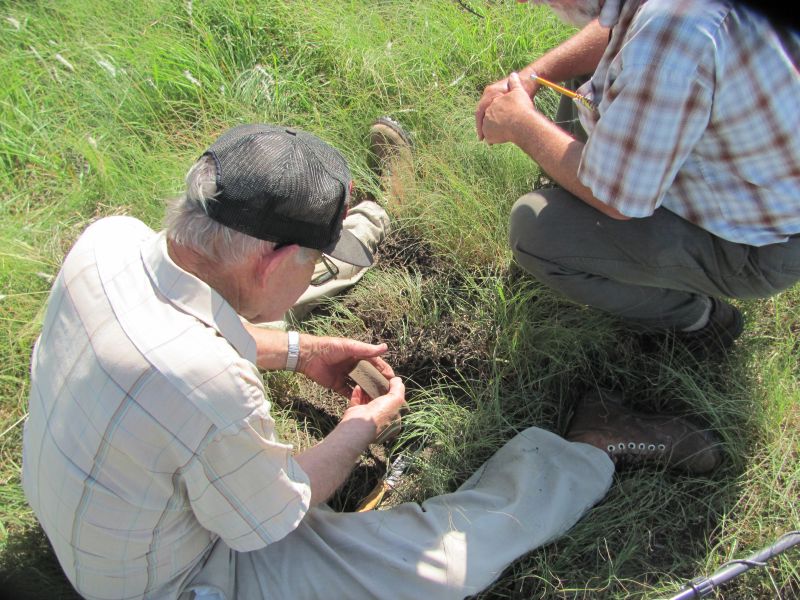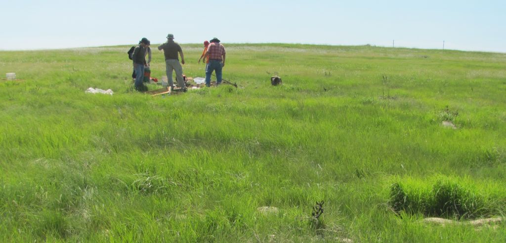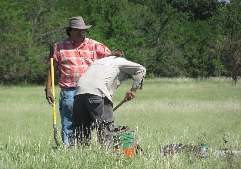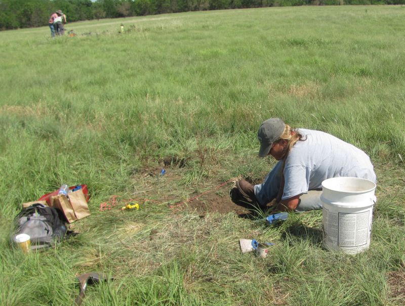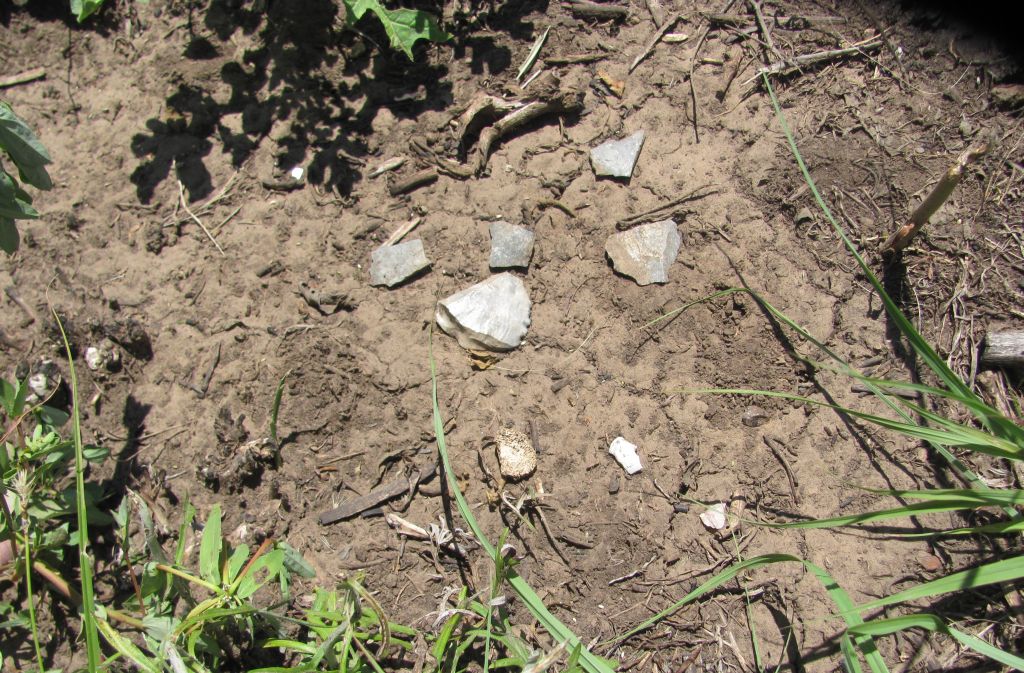Walnut Valley Field School near Augusta As originally defined by Waldo Wedel (1959), the Great Bend Aspect contained two subdivisions, the Little River and Lower Walnut foci. More recent work has shown that the Little River focus needs to be subdivided. Sites near Marion County and those in McPherson County are two expressions of a single unit, while the remaining sites of the focus, on Cow Creek and the Little Arkansas, are somewhat variable and may require subdivision as well. Zehnder (1998) has proposed separating the McPherson sites from Little River and placing them in a Lindsborg phase. Two currently free-floating taxa – the Pratt complex and the Neosho focus – may eventually be assigned to the same unit as the various divisions of Great Bend. Sites in the vicinity of Augusta have not been analyzed sufficiently to allow placement.. 14BU313 Walnut Valley site is the Great Bend Aspect. Age Settlement Pattern The Walnut River rises in northern Butler County and flows generally southward through Butler and Cowley Counties, past the towns of El Dorado, Augusta, Winfield and Douglass. It joins the Arkansas River at Arkansas City. The Walnut's principal tributaries are the Whitewater River, which joins it at Augusta, and the Little Walnut River, which joins it in southern Butler County. The Walnut River drainage basin comprises 2,380 square miles (6,200 km2) in an ecoregion characterized by rocky, rolling hills and prairie. Elevations range from 1,050 to 1,625 feet (320 to 495 m) in the basin. Average precipitation, mostly summer rainfall, varies from 32 to 38 inches (810 to 970 mm) annually. Tallgrass prairie is the most common vegetation, covering 66 percent of the land. Crop land covers 23 percent and woodlands cover five percent. Major crops are wheat, soybeans, cotton, hay, sorgum, and corn. Cattle are the most important livestock.[2] Near the mouth of the Walnut River, just east of Arkansas City, are a large number of archaeological sites. These are believed to be the remains of a Indian settlement visited in 1601 by New Mexico governor Juan de Onate. Onate called the Indians Rayados. They were almost certainly Wichita Indians. Based on Onate's description of the settlement, 10,000 or more Wichita lived along several miles of the Walnut River.[5][6][7] Midden looking South